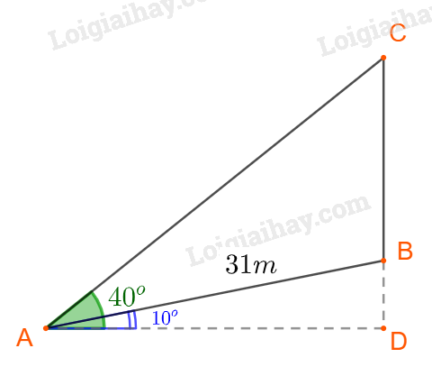 Khi đó ta có: \( \widehat {BAD} = {10^ \circ },\, \widehat {CAD} = {40^ \circ }\) và \(AB=31m\)