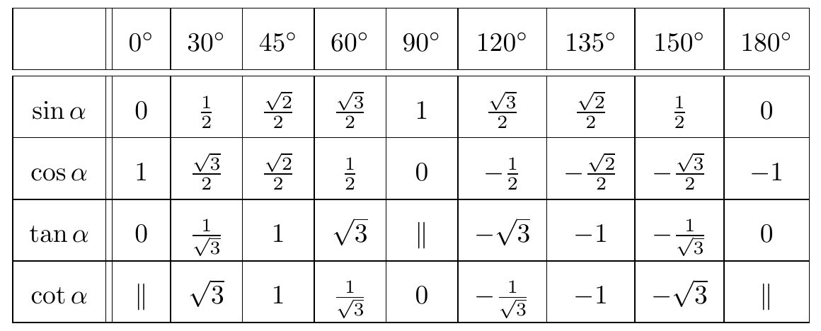 Bảng giá trị lượng giác của các góc đặc biệt