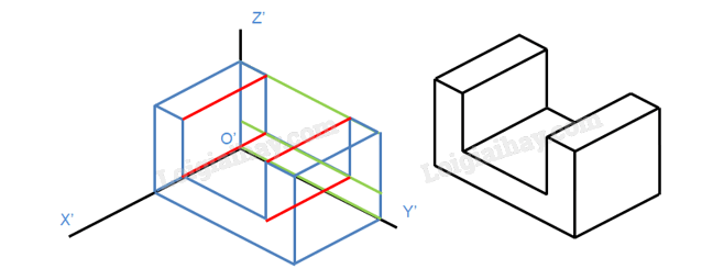 Bước 5: Từ ba hình chiếu vuông góc vừa vẽ, vẽ hình chiếu trục đo vuông góc đều của vật thể.