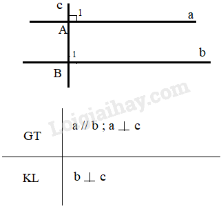 Hãy chứng minh định lí nói ở Ví dụ trang 56: “ Một đường thẳng vuông góc với một trong hai đường thẳng song song thì nó cũng vuông góc với đường thẳng còn lại”. Trong chứng minh đó, ta đã sử dụng những điều đúng đã biết nào?