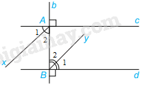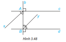 Kẻ các tia phân giác Ax, By của một cặp góc so le trong tạo bởi đường thẳng b vuông góc với hai đường thẳng song song c, d ( H.3.48). Chứng minh rằng hai tia phân giác đó nằm trên hai đường thẳng song song.