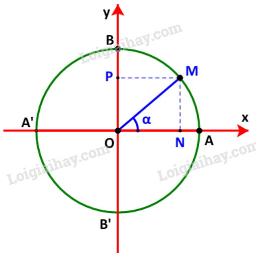Gọi M(x;y) là điểm trên đường tròn đơn vị sao cho \(\widehat {xOM} = \alpha \). Gọi N, P tương ứng là hình chiếu vuông góc của M lên các trục Ox, Oy.