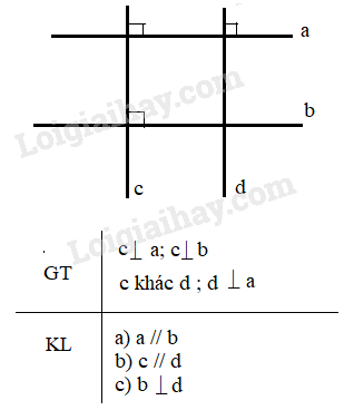 Cho hai đường thẳng phân biệt a, b cùng vuông góc với đường thẳng c; d là một đường thẳng khác c và d vuông góc với a. Chứng minh rằng: a) a // b; b) c // d; c) b vuông góc d