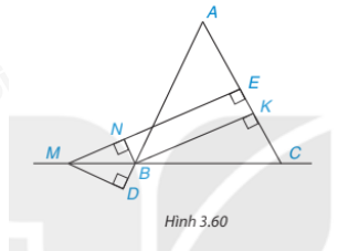 Cho tam giác ABC cân tại A; M là một điểm thuộc đường thẳng BC, B ở giữa M và C. Gọi E và K lần lượt là chân đường vuông góc hạ từ M và từ B xuống AC, còn N, D lần lượt là chân đường vuông góc hạ từ B xuống ME và từ M xuống AB. (H.3.60)