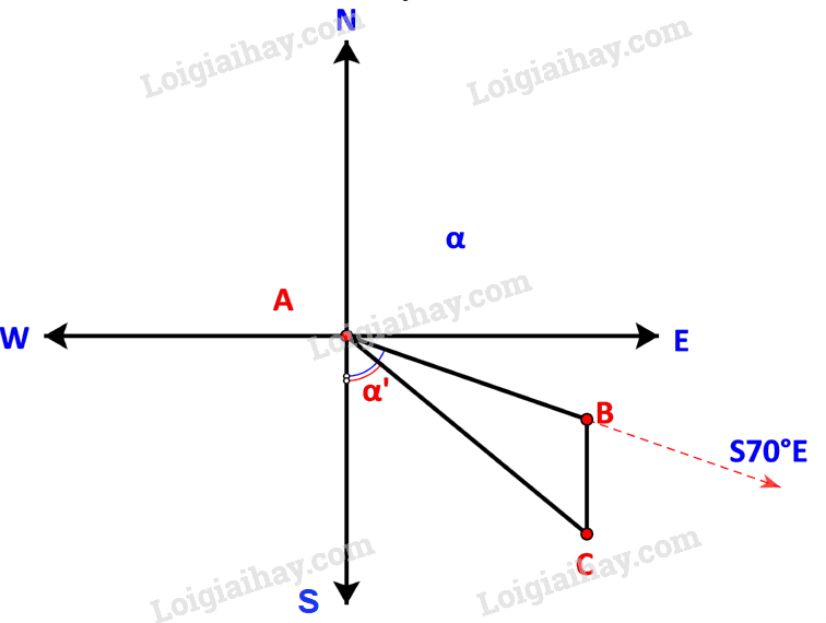 Ban đầu tàu di chuyển theo hướng \(S{70^o}E\) nên \(\widehat {BAS} = {70^o}\). Sau khi động cơ bị hỏng, tàu trôi theo hướng Nam do đó BC song song với AS.