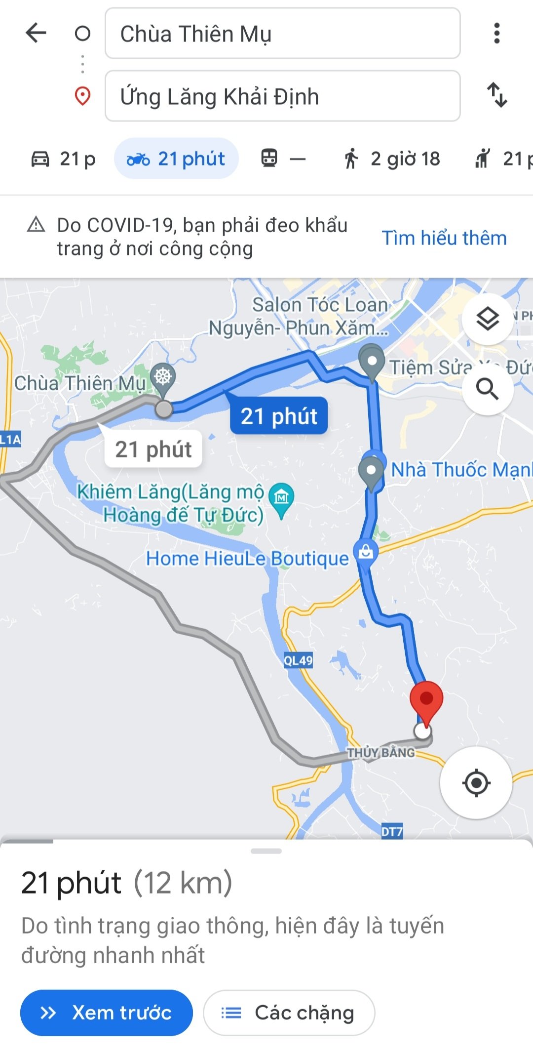 – Tìm trên ứng dụng đường đi từ chùa Thiên Mụ đến lăng Khải Định (Thừa Thiên Huế)