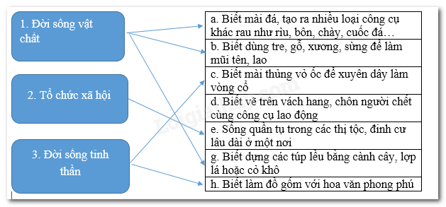 Hãy ghép nội dung ở cột bên trái với cột bên phải cho phù hợp với đời sống vật chất và tinh thần của người nguyên thủy trên đất Việt Nam.