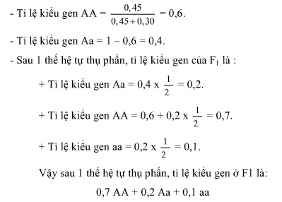 Một quần thể thực vật tự thụ phấn có tỉ lệ kiểu sen ở thế hệ ban đầu là : 0,45AA : 0,30Aa : 0,25aa. Cho biết các cá thể có kiểu gen aa không có khả năng sinh sản. Tính theo lí thuyết, tỉ lệ các kiểu gen thu được ở thế hệ tiếp theo là bao nhiêu ?
