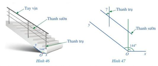 Trong Hình 46, góc xOy bằng 144\(^\circ \). Hỏi góc nhọn tạo bởi một thanh sườn với một thanh trụ của lan can là bao nhiêu độ?