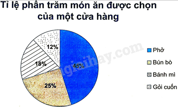 Tỉ lệ phần trăm kết quả phỏng vấn 1 000 khách hàng về sự lựa chọn món ăn của một cửa hàng được thể hiện trong biểu đồ sau: