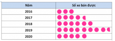Quan sát số xe bán được ở mỗi năm, mỗi biểu tượng hình tròn đại diện cho 10 xe, nửa biểu tượng hình tròn đại diện cho 5 xe từ đó vẽ biểu đồ tranh.
