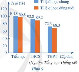 Giáo dục phổ thông ở nước ta gồm ba cấp học là: cấp tiểu học, cấp trung học cơ sở (THCS), cấp trung học phổ thông (THPT). Từ năm 2010 đến năm 2019, giáo dục phổ thông đã có sự cải thiện rõ rệt về việc tăng tỉ lệ đi học chung và đi học đúng tuổi. Biểu đồ cột kép ở Hình 9 biểu diễn tỉ lệ đi học chung và tỉ lệ đi học đúng tuổi của mỗi cấp học ở nước ta năm 2019.
