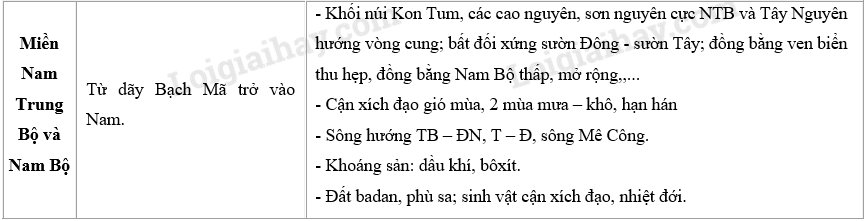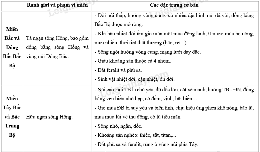 Hãy hoàn thành bảng dưới đây để nêu rõ đặc trưng cơ bản của miền.