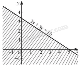 Vậy miền nghiệm của bất phương trình 2x + 3y > 10 là nửa mặt phẳng có bờ là đường thẳng 2x + 3y = 10, không chứa gốc O và không kể đường thẳng 2x + 3y = 10 (miền không bị gạch trong hình dưới đây).