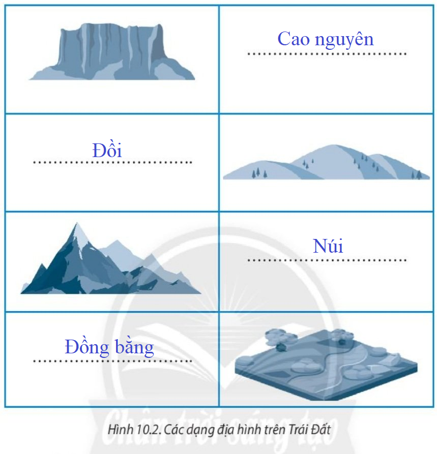 Các dạng địa hình chính trên Trái Đất gồm: núi, đồng bằng, cao nguyên và đồi.
