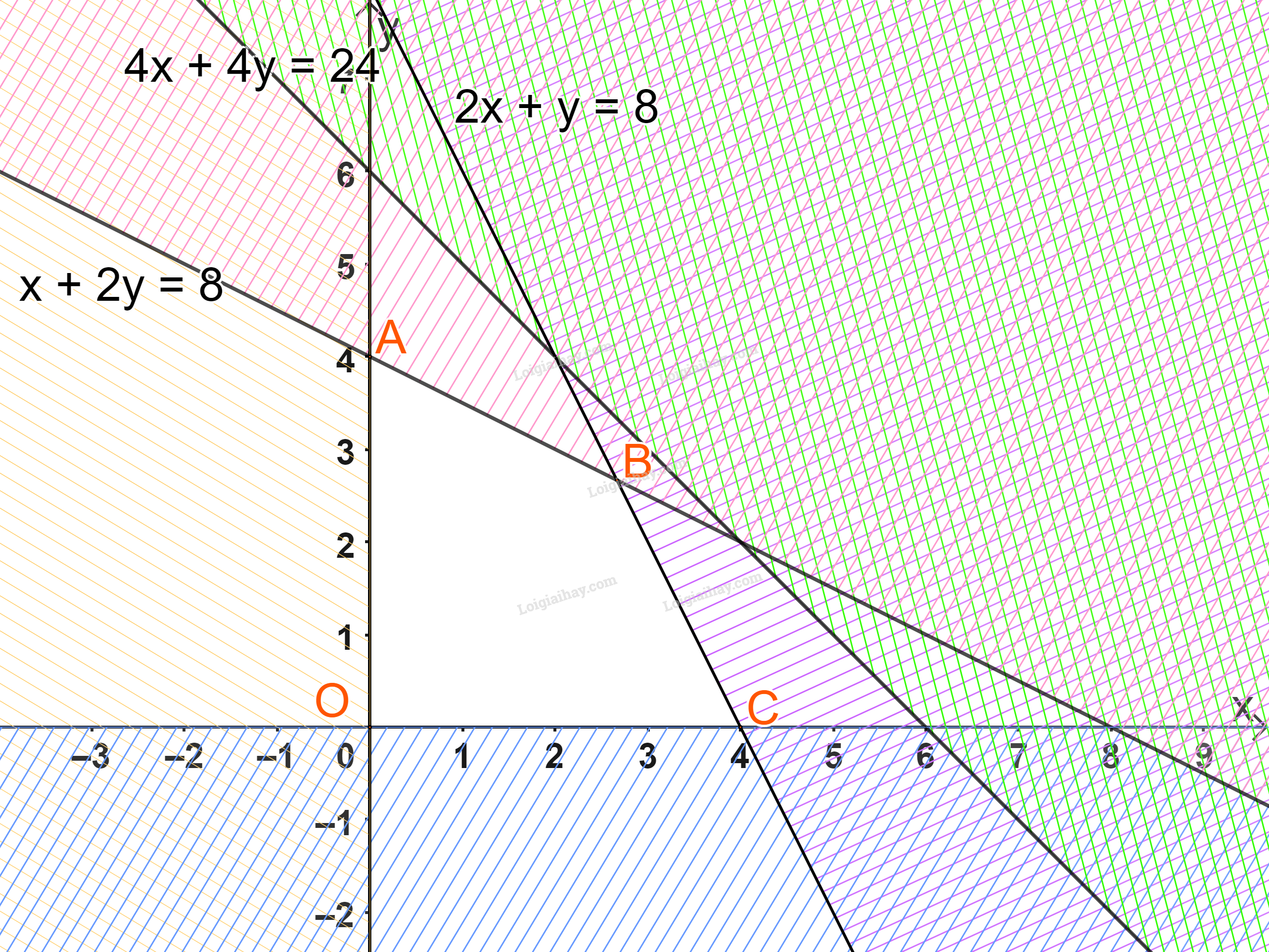 Với các đỉnh  \(O(0;0),A(0;4),\)\(B(\frac{8}{3};\frac{8}{3}),\)\(C(4;0).\)