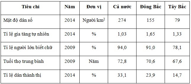 Dưới đây là một số tiêu chí về dân cư, xã hội ở Trung du và miền núi Bắc Bộ.