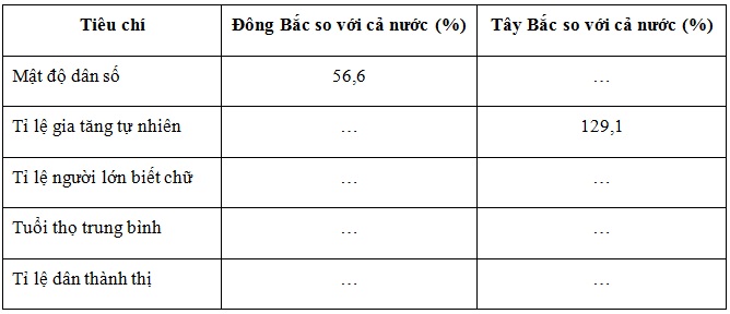 a) Hãy tính tỉ lệ các tiêu chí phát triển dân cư, xã hội của hai tiểu vùng Đông Bắc và Tây Bắc so với cả nước (cả nước = 100%). Ghi kết quả vào bảng sau: