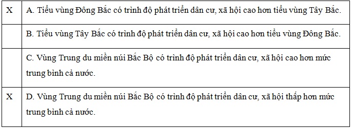 A. Tiểu vùng Đông Bắc có trình độ phát triển dân cư, xã hội cao hơn tiểu vùng Tây Bắc.