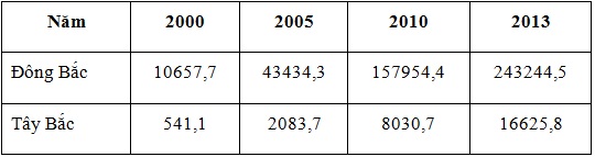 GIÁ TRỊ SẢN XUẤT CÔNG NGHIỆP Ở CẢ HAI TIỂU VÙNG ĐÔNG BẮC VÀ TÂY BẮC THEO GIÁ TRỊ THỰC TẾ (tỉ đồng)