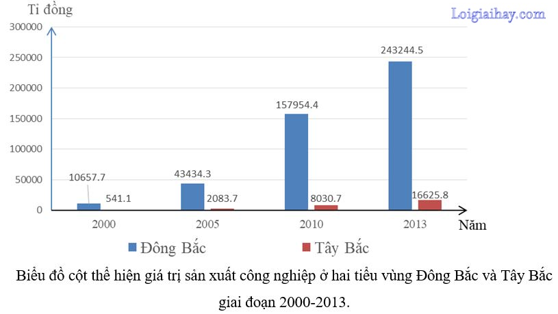 Hãy vẽ biểu đồ cột thể hiện giá trị sản xuất công nghiệp ở hai tiểu vùng trên.