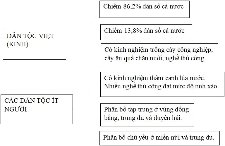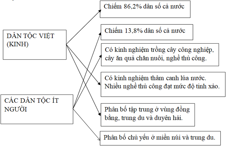 Giải bài 3 trang 5 vở bài tập Địa lí 9, Nối các ô bên trái với các ô bên phải sao cho phù hợp với đặc điểm dân tộc ít người và dân tộc kinh.