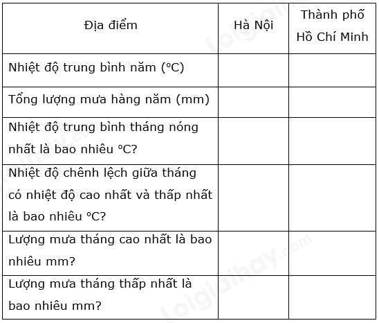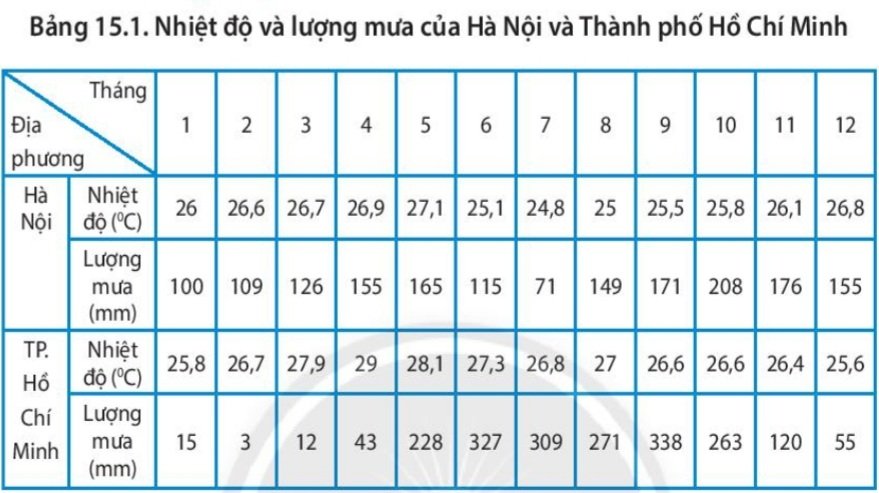 Cho bảng số liệu sau: Dựa vào bảng 15.1 để điền các thông tin vào bảng dưới đây: Hãy nhận xét nhiệt độ và lượng mưa của Hà Nội và Thành phố Hồ Chí Minh có điểm nào giống nhau? Điểm nào khác nhau?