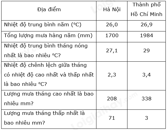 Hãy nhận xét nhiệt độ và lượng mưa của Hà Nội và Thành phố Hồ Chí Minh có điểm nào giống nhau? Điểm nào khác nhau?