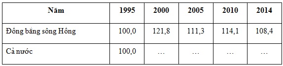Dựa vào số liệu bình quân lương thực theo đầu người của cả nước (năm 1995: 363,1kg/người, năm 2000: 444,8 kg/người, năm 2005: 480,9 kg/người, năm 2010: 513,4 kg/người, năm 2014: 553,1 kg/người), tính toán rồi điền nội dung phù hợp vào bảng sau: