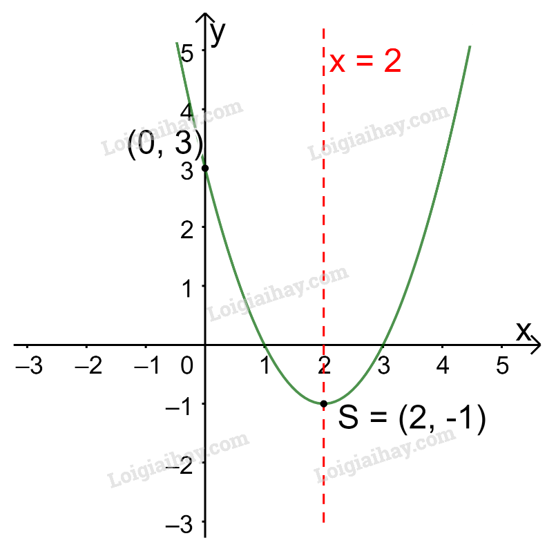 + Có đỉnh S với hoành độ: \({x_S} = \frac{{ – b}}{{2a}} = \frac{{ – ( – 4)}}{{2.1}} = 2;{y_S} = {2^2} – 4.2 + 3 =  – 1.\)
