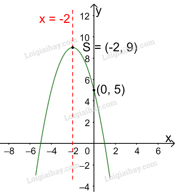 + Có đỉnh S với hoành độ: \({x_S} = \frac{{ – b}}{{2a}} = \frac{{ – ( – 4)}}{{2.( – 1)}} =  – 2;{y_S} =  – {( – 2)^2} – 4.( – 2) + 5 = 9.\)