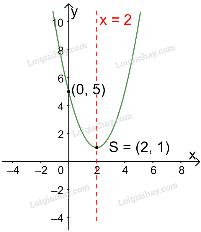 + Có đỉnh S với hoành độ: \({x_S} = \frac{{ – b}}{{2a}} = \frac{{ – ( – 4)}}{{2.1}} = 2;{y_S} = {2^2} – 4.2 + 5 = 1.\)