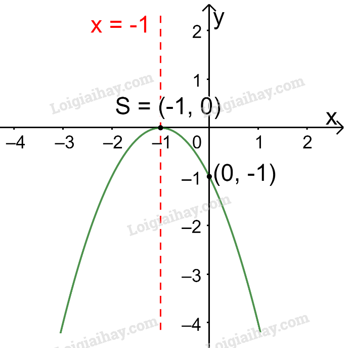 + Có đỉnh S với hoành độ: \({x_S} = \frac{{ – b}}{{2a}} = \frac{{ – ( – 2)}}{{2.( – 1)}} =  – 1;{y_S} =  – {( – 1)^2} – 2.( – 1) – 1 = 0\)