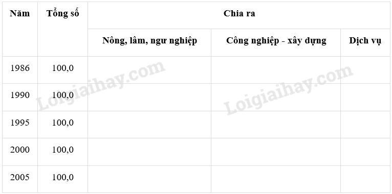 + Giai đoạn 1986 – 1990, nông – lâm – ngư nghiệp chiếm tỉ trọng cao nhất (45,6% năm 1990), công nghiệp – xây dựng và dịch vụ thấp hơn (lần lượt là 22,7% và 31,7%)
