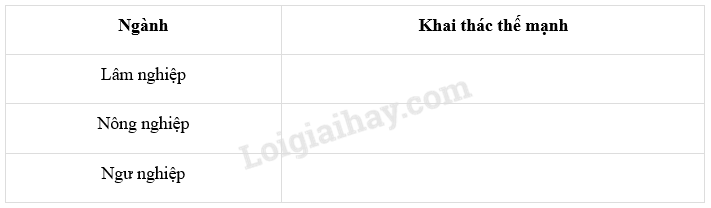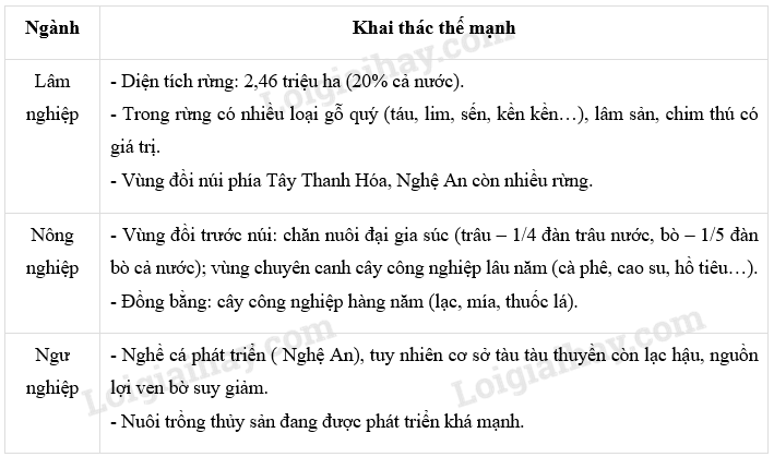 Hãy nêu việc khai thác các thế mạnh về lâm nghiệp, nông nghiệp và ngư ngư nghiệp của Bắc Trung Bộ vào bảng dưới đây: