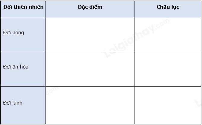 Dựa vào hình 20.3 và bảng thông tin trong SGK, em hãy nêu một số đặc điểm của các đới thiên nhiên trên thế giới và kể tên các châu lục thuộc đới thiên nhiên đó.