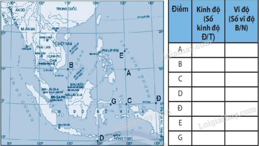 Dựa vào hình 1.2, hãy xác định tọa độ địa lí của các điểm A, B, C, D, Đ, E, G được đánh dấu trên bản đồ.