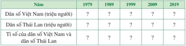 b) Quan sát bảng số liệu ở phần a), so sánh tỉ số dân số Việt Nam và dân số Thái Lan qua các năm và rút ra kết luận năm nào lớn nhất.