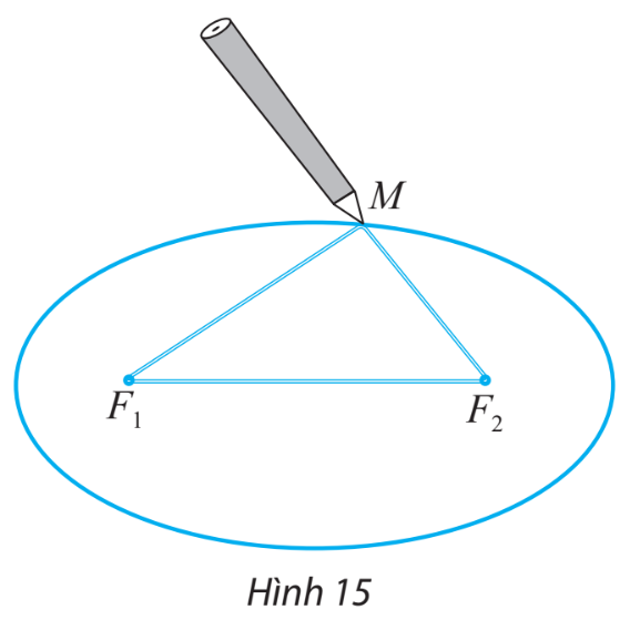 – Quàng vòng dây qua hai chiếc đinh và kéo căng tại một điểm M nào đó. Tựa đầu bút chì vào trong vòng dây tại điểm M  rồi di chuyển sao cho dây luôn luôn căng. Đầu bút chì vạch lên tấm bìa một đường elip (Xem minh họa trong hình 15).