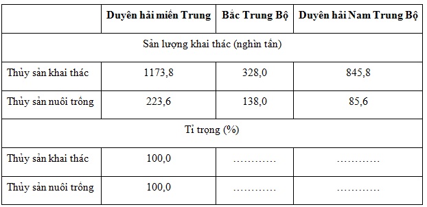 a) So sánh sản lượng thủy sản của Bắc Trung Bộ, Duyên hải Nam Trung Bộ so với toàn vùng Duyên hải miền Trung, điền vào ô trống (…) trong bảng.