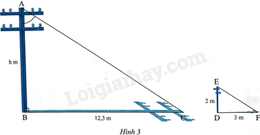 Do đó, $\Delta ABC\backsim \Delta EDF\left( g.g \right)$, suy ra \(\frac{{AB}}{{ED}} = \frac{{BC}}{{DF}}\), hay \(\frac{h}{2} = \frac{{12,3}}{3}\), vậy \(h = \frac{{12,3.2}}{3} = 8,2\left( m \right)\)