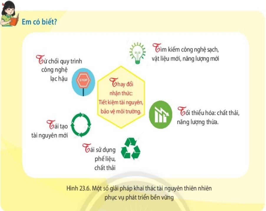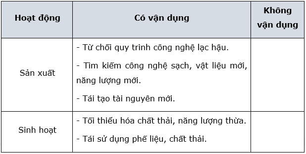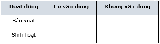 Em hãy liệt kê những hoạt động sản xuất và sinh hoạt ở nơi em đang sinh sống có vận dụng và không vận dụng các giải pháp khai thác tài nguyên thiên nhiên phục vụ phát triển bền vững hình 23.6 trong SGK vào bảng sau: