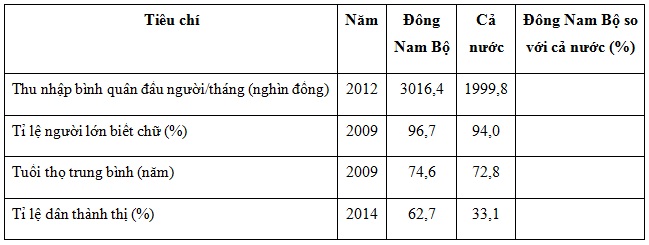 a) Dựa vào bảng dưới đây, hãy so sánh các tiêu chí phát triển dân cư, xã hội của Đông Nam Bộ so với cả nước (cả nước=100%). Ghi kết quả vào ô trống trong cột “Đông Nam Bộ so với cả nước”.