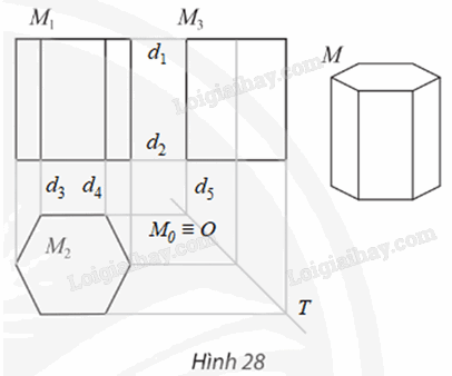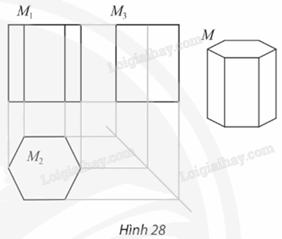 Trong bản vẽ biểu diễn hình lăng trụ lục giác đều trong Hình 28.