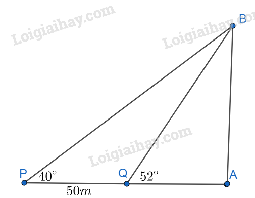 Hai chiếc tàu thủy P Q cách nhau 50 m. Từ P Q thẳng hàng với chân A của tháp hải đăng AB ở trên bờ biển, người ta nhìn chiều cao AB của tháp dưới các góc \(\widehat {BPA} = 40^\circ \) và \(\widehat {BQA} = 52^\circ \). Tính chiều cao của tháp hải đăng đó.