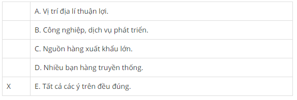 Giải bài 3 trang 83 vở bài tập Địa lí 9, Đánh dấu (X) vào ý đúng nhất. TP. Hồ Chí Minh dẫn đầu trong hoạt động xuất nhập khẩu của vùng Đông Nam Bộ và của cả nước là do những điều kiện thuận lợi nào? A. Vị trí địa lí thuận lợi. B. Công nghiệp, dịch vụ phát triển. C. Nguồn hàng xuất khẩu lớn. D. Nhiều bạn hàng truyền thống. E. Tất cả các ý trên đều đúng.