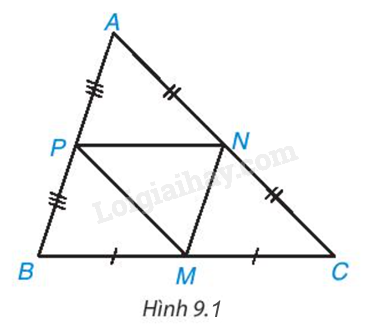 Trong hình 9.1, ABC là tam giác không cân; M, N, P lần lượt là trung điểm của BC, CA, AB. Hãy tìm trong hình năm tam giác khác nhau mà chúng đôi một đồng dạng với nhau. Giải thích vì sao chúng đồng dạng