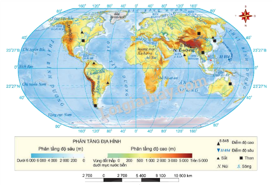Hình 2.2.  Bản đồ địa hình và sự phân bố một số mỏ sắt, than trên thế giới