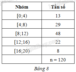 Cho mẫu số liệu ghép nhóm thống kê thời gian sử dụng điện thoại trước khi ngủ (đơn vị: phút) của một người trong 120 ngày như ở Bảng 8. Xác định các số đặc trưng đo xu thế trung tâm cho mẫu số liệu đó (làm tròn các kết quả đến hàng phần mười).
