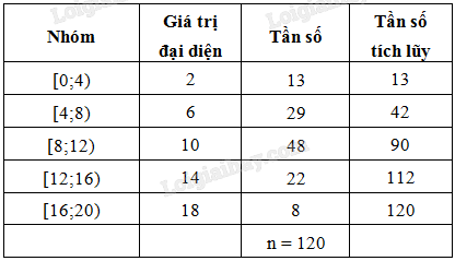 – Ta có: \(\frac{{3n}}{4} = \frac{{3.120}}{4} = 90\) mà \(90 = 90 < 112.\) Suy ra nhóm 4 là nhóm đầu tiên có tần số tích lũy lớn hơn hoặc bằng 90.